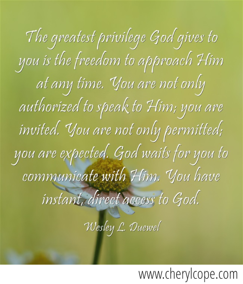 The greatest privilege God gives to you is the freedom to approach Him at any time. You are not only authorized to speak to Him; you are invited. You are not only permitted; you are expected. God waits for you to communicate with Him. You have instant, direct access to God. Wesley L. Duewel Click to tweet part of this quote. To “pin” the pic, hover your mouse over it.