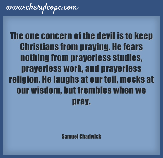 The one concern of the devil is to keep Christians from praying. He fears nothing from prayerless studies, prayerless work, and prayerless religion. He laughs at our toil, mocks at our wisdom, but trembles when we pray. Samuel Chadwick Click to tweet part of this quote. To “pin” the pic, hover your mouse over it.