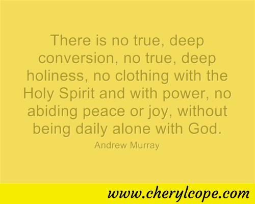 There is no true, deep conversion, no true, deep holiness, no clothing with the Holy Spirit and with power, no abiding peace or joy, without being daily alone with God. Andrew Murray Click to tweet part of this quote. To “pin” the pic, hover your mouse over it.