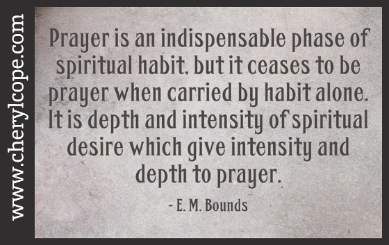 Prayer is an indispensable phase of spiritual habit, but it ceases to be prayer when carried by habit alone. It is depth and intensity of spiritual desire which gives intensity and depth to prayer. E. M. Bounds To “pin” the pic, hover your mouse over it.