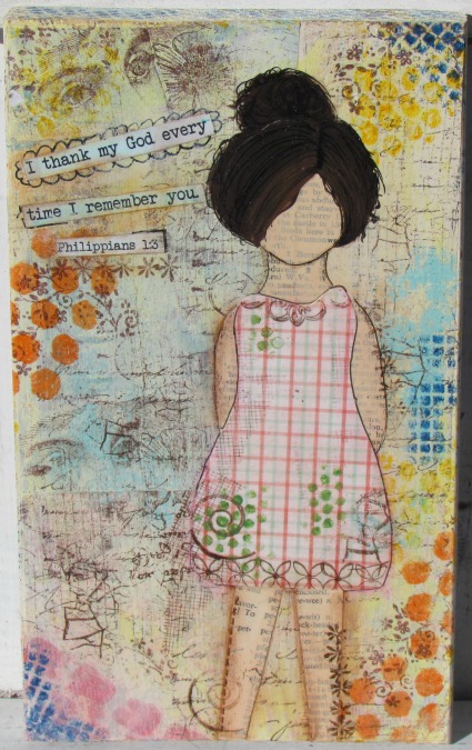 A7. I type out scriptures that I feel will encourage someone and then glue them somewhere on the art. My favorite thing to do is, I make girls and putting the scripture across their heart is what I love to do.